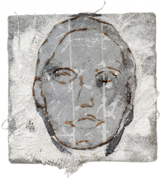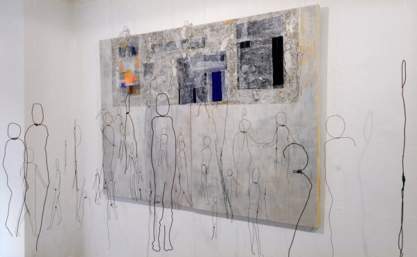 Draht auf Leinwand, 50 Figuren im Vordergrund hängend, 140 x 200 cm