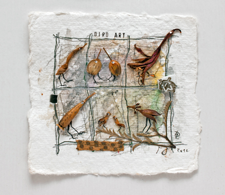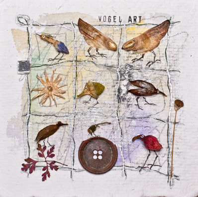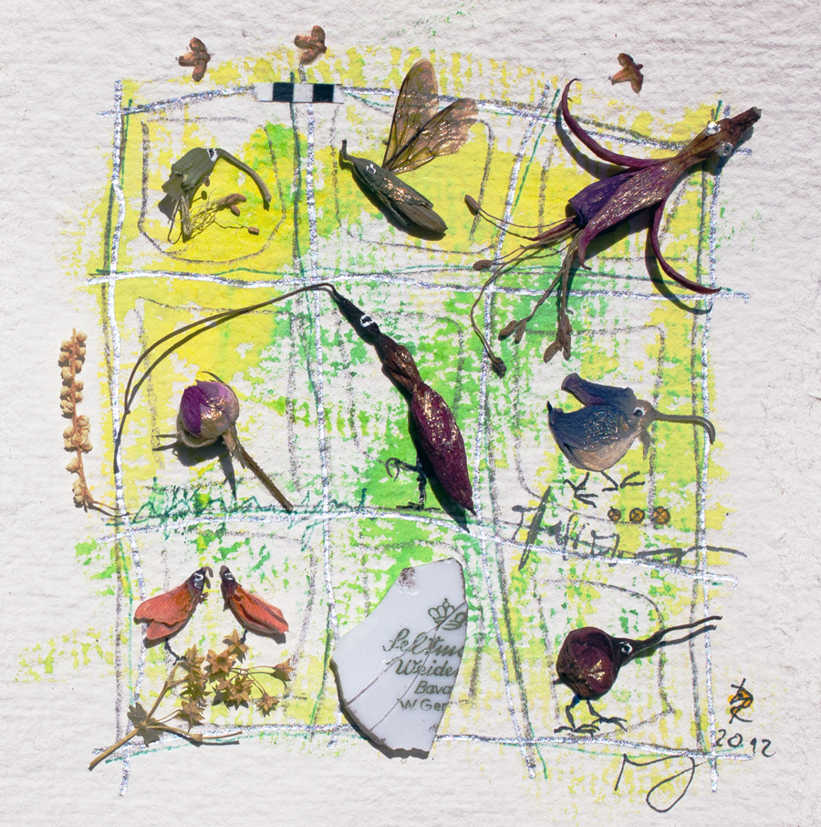 Material: getrocknetes Blatt, Fliedersamenkapsel und andere Pflanzenreste sowie Knopf auf bemaltem Aquarellpapier.