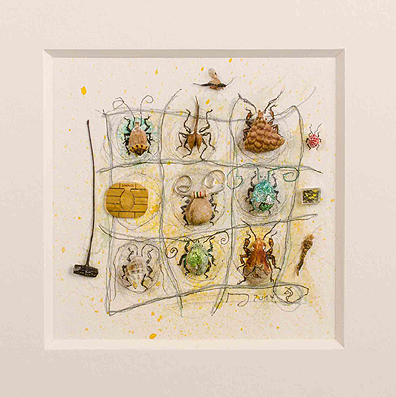 Schokoladenpapier, tote Fliege, Muschel, Computerchip, elektronischer Widerstand und Spiegelscherbe auf bemaltem Aquarellpapier.
