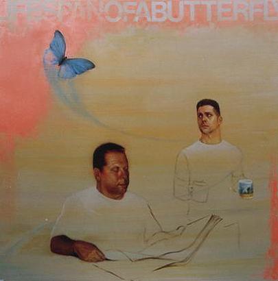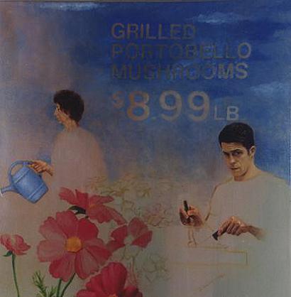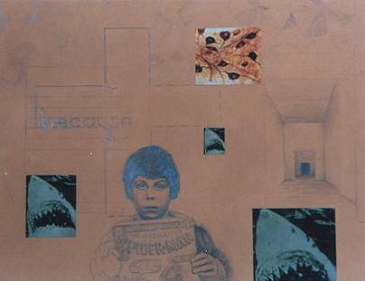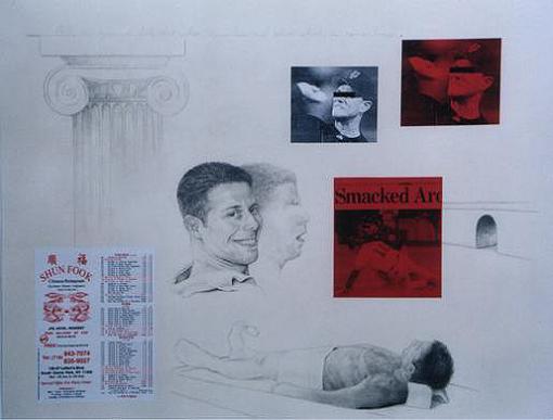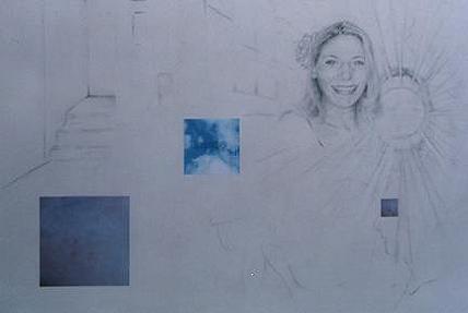 | Selfportrait with mom , 1999 Oil on Linen 76x76 cm | Denise in a dream , 2003 Pencil and collage on paper 65 x 50 cm. | Selfportrait with pop , 1999 Oil and acrylic on canvas 76x76 cm | The artist at 9 years old , 2002 Pencil and collage on paper 40 x 30 cm | Watching the game , 2002 Pencil and collage on paper 65 x 50 cm |